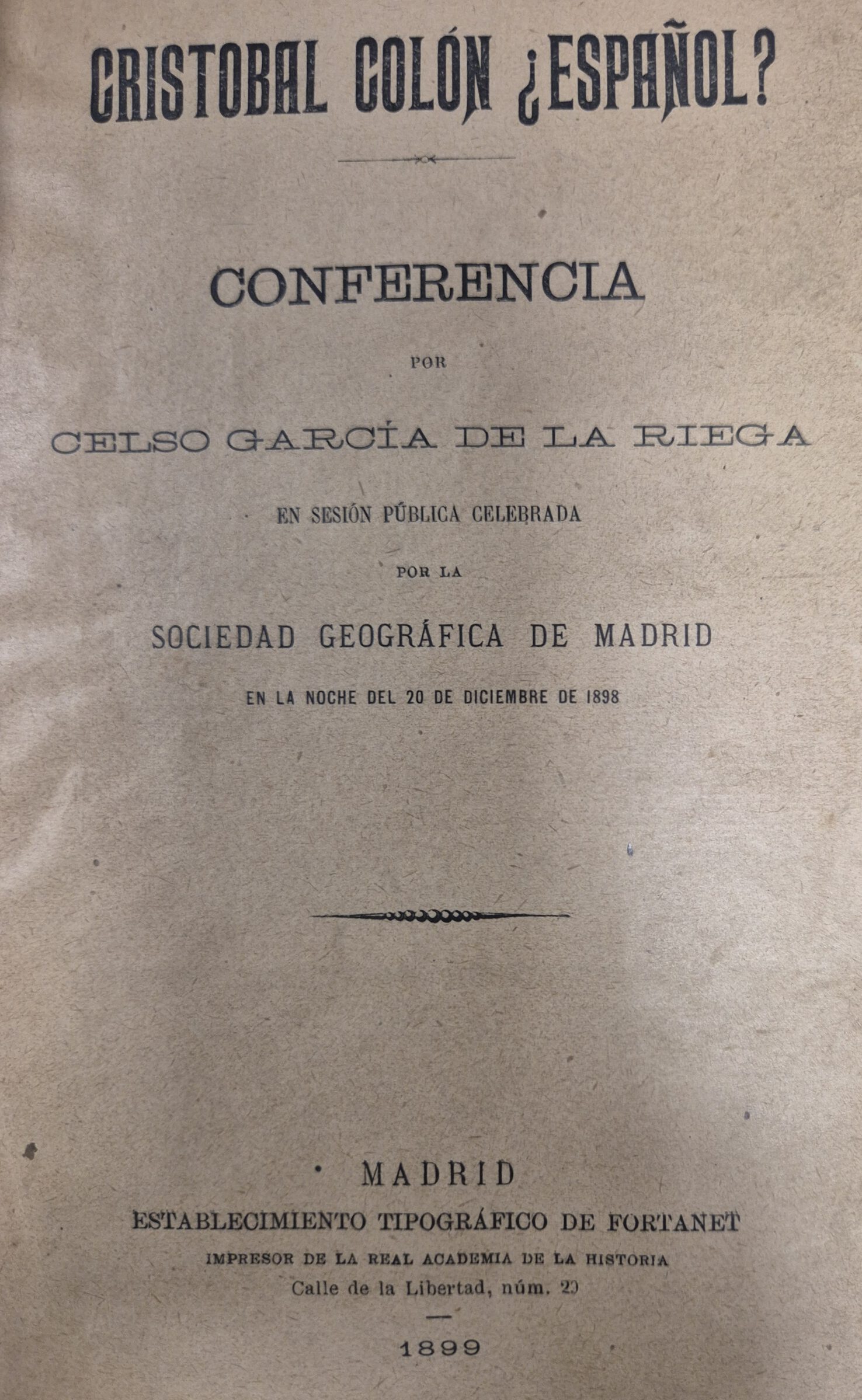Conferencia por Celso García de la Riega en sesión pública celebrada por la Sociedad Geográfica de Madrid en la noche del 20 de diciembre de 1898.