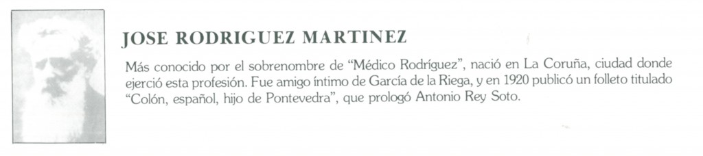 El comité directivo de Pontevedra designado después de la conferencia pronunciada por el doctor Rodríguez Martínez, «colón español», quedó constituido de la siguiente manera: Presidente, don Vicente Riestra Calderón; vicepresidente, don Prudencio Otero Sánchez y alcalde de Pontevedra; secretarios, don Isidoro Millán y don Juan Bautista Andrade; contador, don José Otero Búa, tesorero, don Santiago Riestra Calderón; vocales, don Agustín Sobrino, don Valentín Villanueva, Don Perfecto Feijoo, directores de los Establecimientos docentes presidentes del Casio y Artesanos, y directores de «Diario de Pontevedra» y el Progreso.