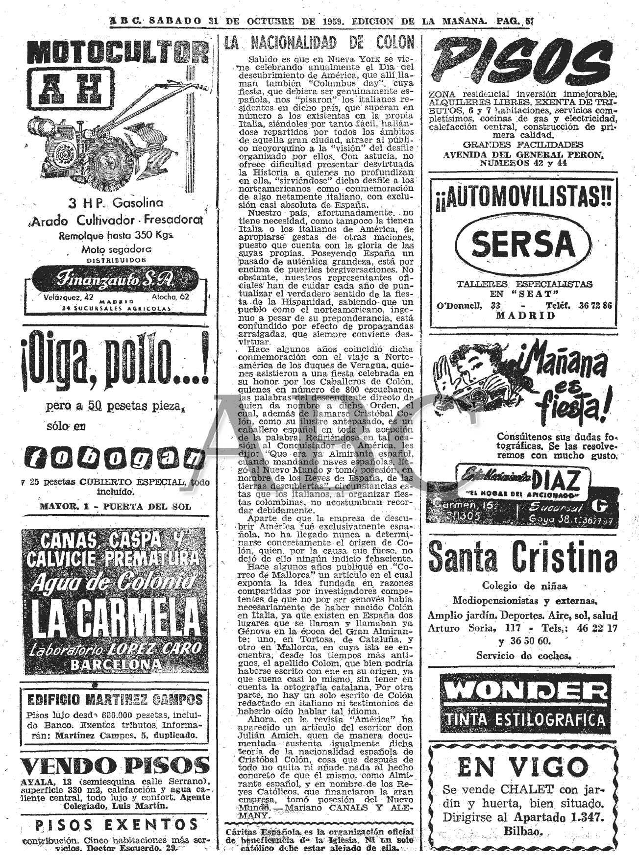 Con el fin de que quede esclarecido de una vez para siempre el lugar del nacimiento del gran navegante, ha abierto A B C el concurso cuyas bases publicamos a continuación, ya que jamás se habría podido determinar la nacionalidad de Colón en una polémica periodística, aun pudiendo probarse documentalmente que Colón nunca nombró a la carabela en que realizó su glorioso viaje la Santa María, y sí la GALLEGA, en recuerdo, por lo visto, de haber nacido en Génova.